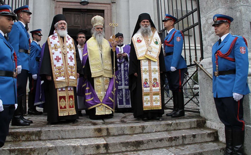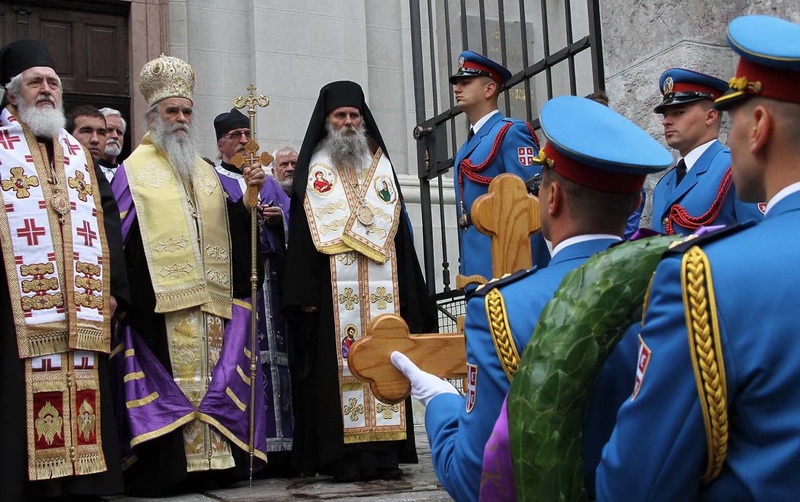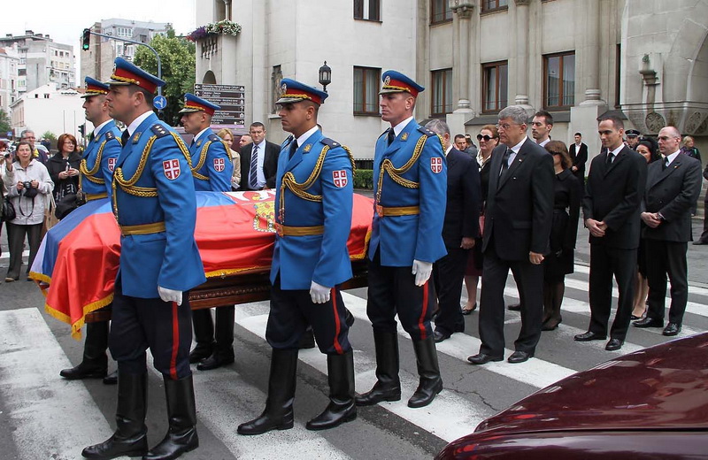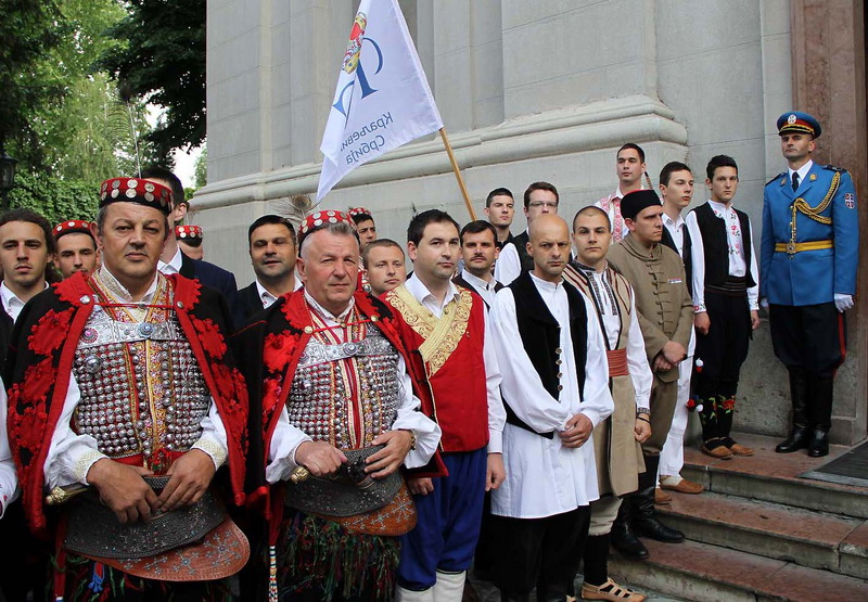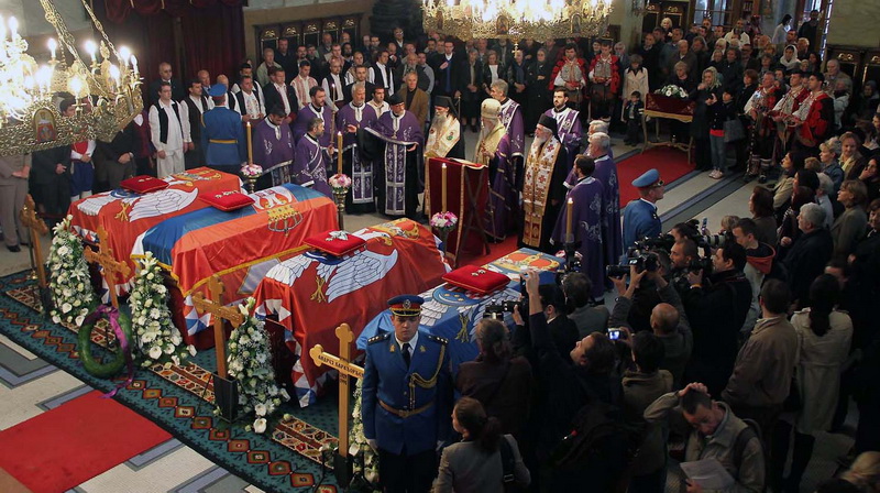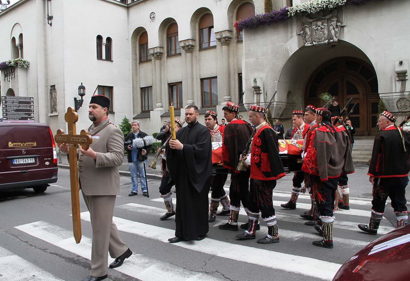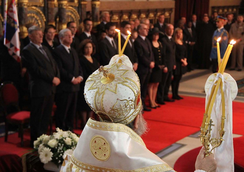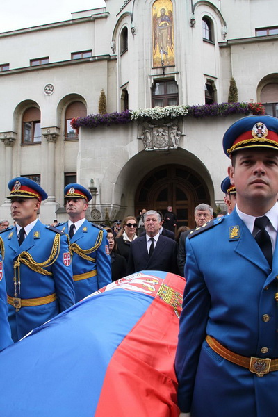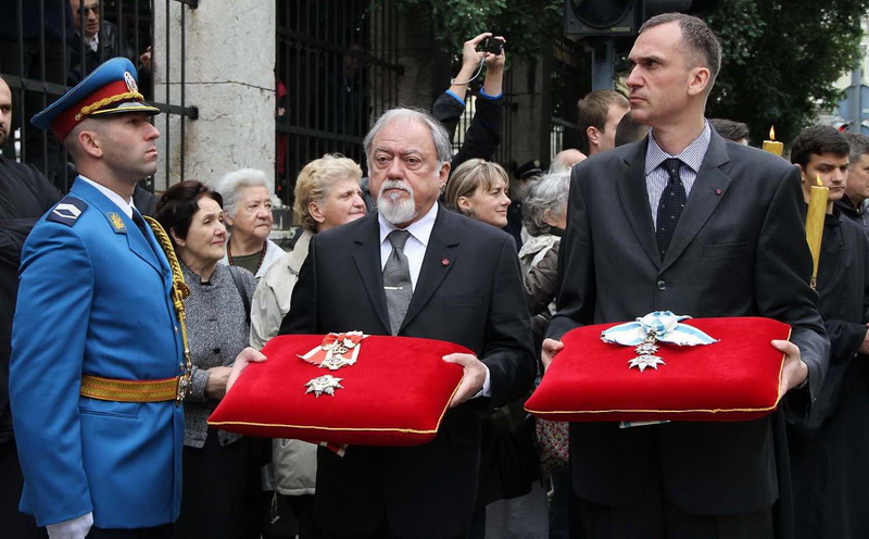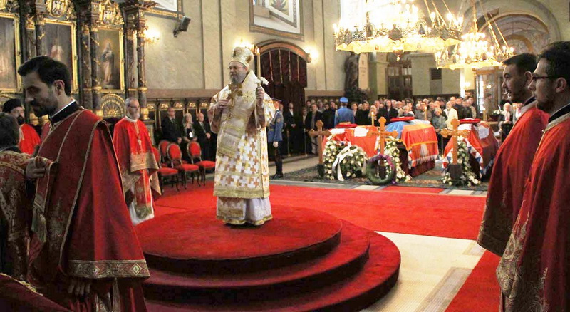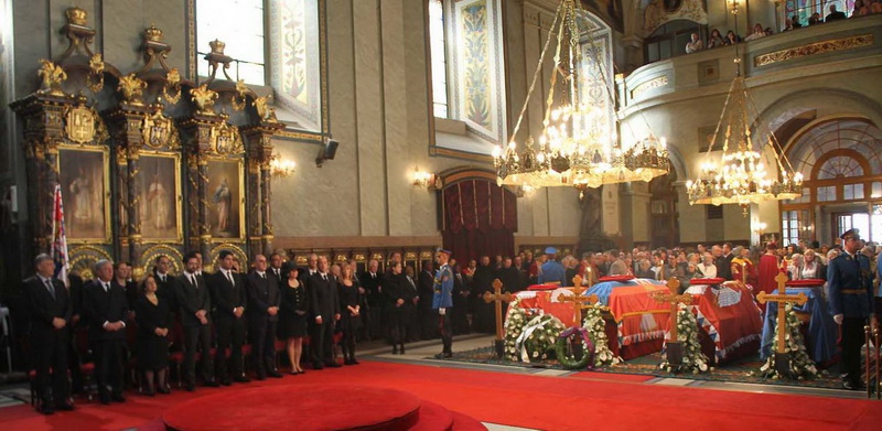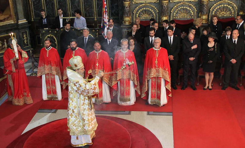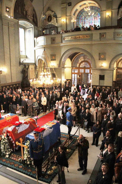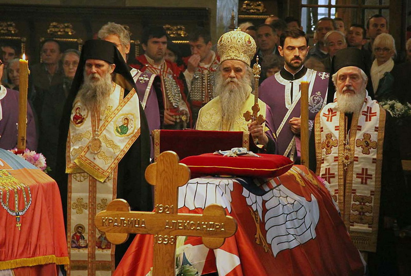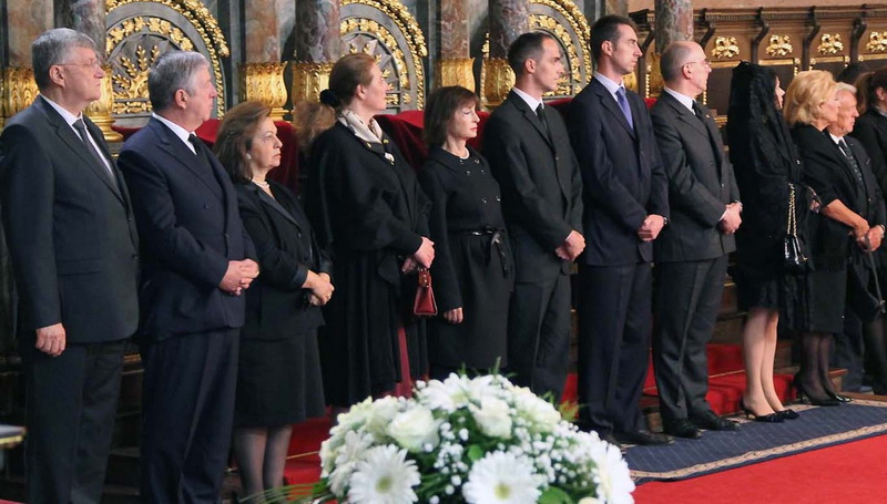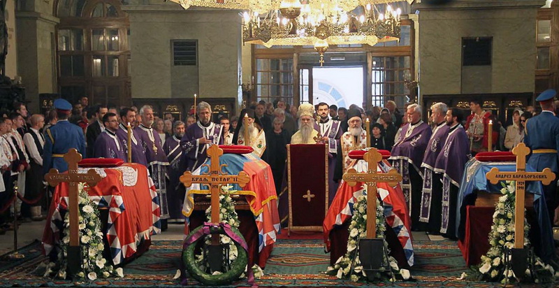 ![]() Помен Карађорђевићима Ковчег краља Петра II, последњег југословенског краља, постављен је у централном делу, у правцу олтарских двери; његове мајке, краљице Марије, са десне стране; његове супруге, краљице Александре, са леве стране, а лево од ње и ковчег краљевића Андреја. Испод ковчега краљице Марије постављен је ћилим са народним мотивима, који је она, заједно са својим супругом, краљем Александром Карађорђевићем, купила за њихово венчање (уприличено у Саборној цркви у Београду, 1922). Догађају су присуствовали и Њ.К.В. престолонаследник Александар II и принцеза Катарина, изасланик председника Николића проф. др Оливер Антић, Њихова Краљевска Височанства принцеза Катарина, принц Ђорђе и принц Михајло (деца принца Томислава), принц Владимир (син краљевића Андреја), принцеза Бригита и принцеза Јелисавета Карађорђевић. Певало је Прво београдско певачко друштво, под руковођењем хоровође Катарине Вешковац. Са благословом Њ.Св. патријарха српског Иринеја, помен су служили Њ.Впр. митрополит црногорско-приморски Амфилохије, Њ.Пр. епископ средњеевропски Константин и Њ.Пр. епископ липљански Јован. Митрополит Амфилохије је истакао да је династија Карађорђевић уградила себе у историју српског народа 19. и 20. века, као и у биће и судбину народа. Целивајући ковчег краља Петра, митрополит је рекао: "Као што су себе уградили у слободу и ослобођење народа, тако су Карађорђевићи себе уградили и у страдање народа. Кад је народ страдао – страдали су и они. /.../ Петар Петровић Његош је, у Посвети праху оца Србије, записао за родоначелника династије Карађорђевић да је удахнуо живот српској души. Ове ријечи које важе за њега, важе и за његове потомке". Г. Оливер Антић је оценио да је, враћањем земних остатака Карађорђевића у Србију и њиховом сахраном са осталим члановима српске владарске породице, омогућено поновно уједињење српског народа. У целодневном мимоходу у Саборној цркви, српски народ је, по први пут у историји, био у прилици да ода почаст овим почившим члановима династије Карађорђевић.