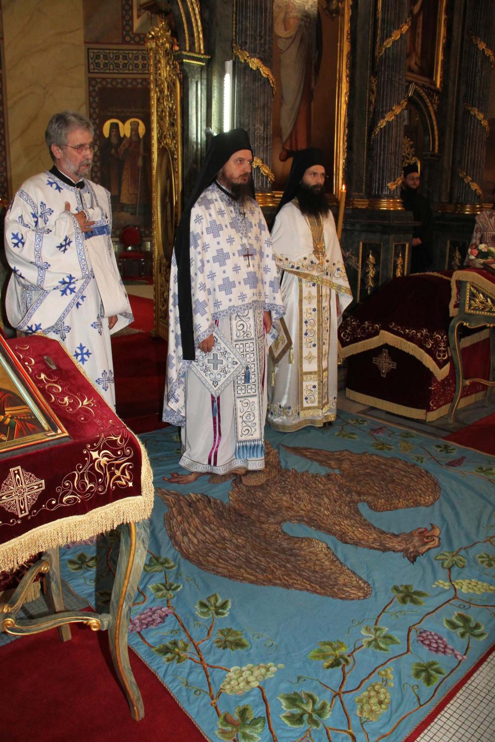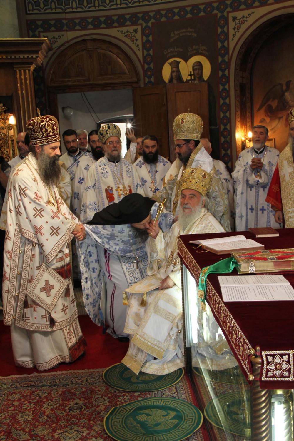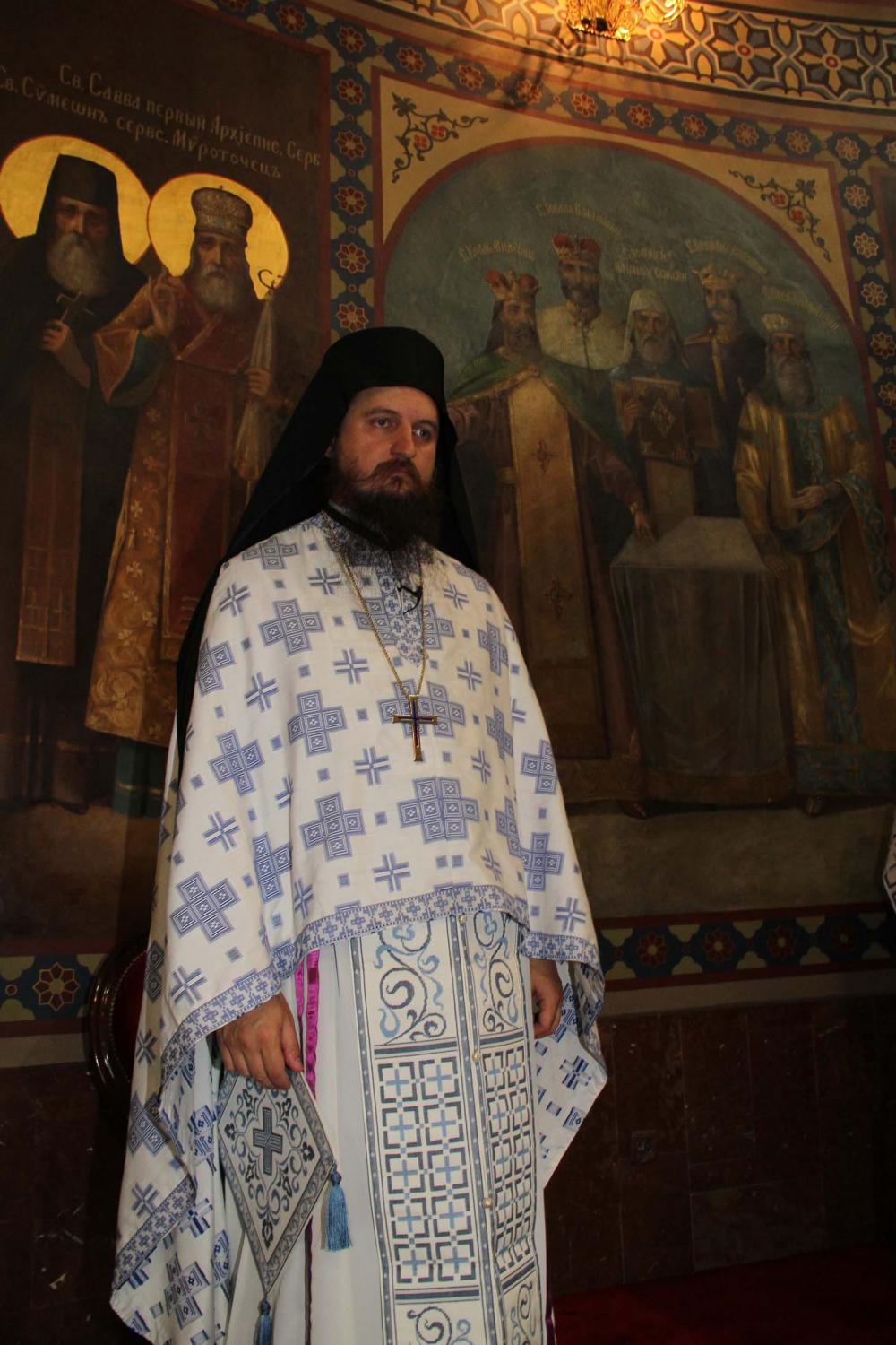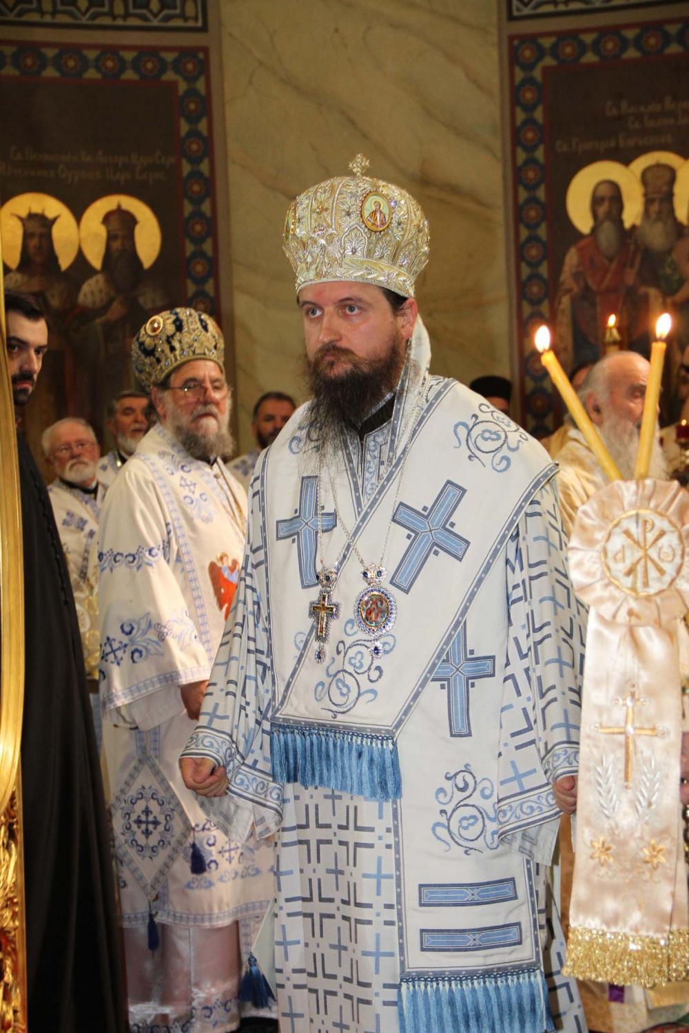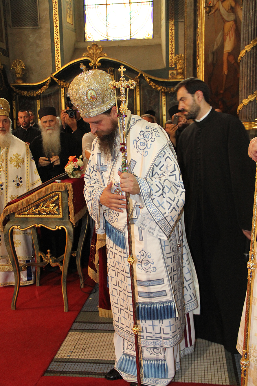 ![]() Епископ Сергије (Карановић) Наречење Дан раније, у петак, 25. јула 2014. године, на празник иконе Пресвете Богородице Тројеручице, у овом храму је служено и свечано бденије са наречењем архимандрита Сергија за епископа средњеевропског. Чином наречења началствовао је Његова Светост патријарх српски Иринеј, уз архијереје: сафитског Димитрија (Антиохијска црква), сремског Василија, банатског Никанора, зворничко-тузланског Хризостома, врањског Пахомија, бихаћко-петровачког Атанасија, ваљевског Милутина, рашко-призренског Теодосија, брегалничког Марка, умировљеног зворничко-тузланског Василија и умировљеног средњоевропског Константина. Архимандрит Сергије (Карановић) је за епископа средњеевропског изабран на овогодишњем редовном пролећном заседању Светог Архијерејског Сабора СПЦ, 23. маја. Пошто је, током службе наречења, пред целим сабрањем изјавио да се повинује вољи Светог Архијерејског Сабора, који га је и изабрао за епископа, началствовао је вечерњом службом Педесетнице. Саслуживали су му: архимандрит Иларион - новоизабрани епископ тимочки, архимандрит Арсеније - новоизабрани епископ топлички, архимандрит Јероним - новоизабрани епископ јегарски, као и архимандрит Серафим - игуман манастира Рмањ, уз служитеље Архиепископије београдско-карловачке. Појали су појци-студенти Богословског факултета у Београду и Прво београдско певачко друштво. Хиротонија Свету Архијерејску Литургију је, 26. јула, служио Његова Светост патријарх српски Иринеј, уз саслужење Високопреосвећеног митрополита загребачко-љубљанског Порфирија и преосвећену господу епископе: сремског Василија, бачког Иринеја, сафитског Димитрија, осечко-пољског Лукијана, зворничко-тузланског Хризостома, врањског Пахомија, бихаћко-петровачког Атанасија, горњокарловачког Герасима, далматинског Фотија, брегалничког Марка, крушевачког Давида, полошко-кумановског Јоакима, умировљеног средњоевропског Константина, као и архимандрита Илариона - новоизабраног епископа тимочког, архимандрита Арсенија - новоизабраног епископа топличког, архимандрита Јеронима - новоизабраног епископа јегарског. Молитвено учешће у овој свечаној служби узели су и епископи западноамерички Максим и умировљени зворничко-тузлански Василије. Саслуживали су свештенослужитељи из више епархија СПЦ. Свечаној Литургији присуствовали су и представници државних и градских власти, међу њима и: г. Милета Радојевић, директор Управе за сарадњу са црквама и верским заједницама; г. Игор Радојчић, председник Владе Републике Српске; г. Драган Давидовић, министар вера Републике Српске; аташе Немачке амбасаде у Београду; папски нунције надбискуп Орландо Антонини; представници Римокатоличке цркве из Немачке. Наречени владика Сергије је исповедио своју православну веру у Тројичног Бога, пред патријархом, архијерејима и читавом Црквом Божијом. Током Свете Литургије, по појању Трисвете песме, високодостојни архимандрит Сергије (Карановић) хиротонисан (рукоположен) је у чин епископа. На крају Литургије, епископу Сергију се обратио патријарх српски Иринеј, очинским поукама за будућу епископску службу. Затим се епископ средњоевропски Сергије обратио сабраном народу приступном беседом. Приступна беседа епископа Сергија У име Оца, Сина и Светога Духа. У име Оца,Сина и Светога Духа, ми Хришћани у свом живот
