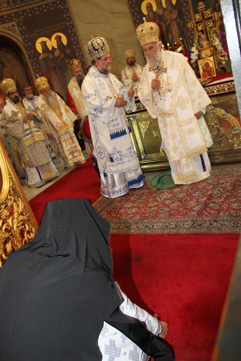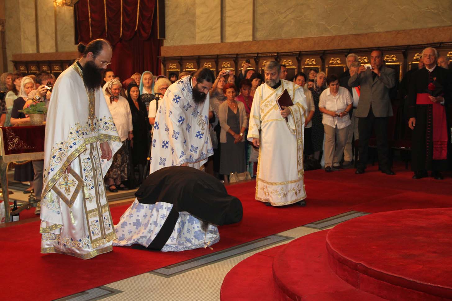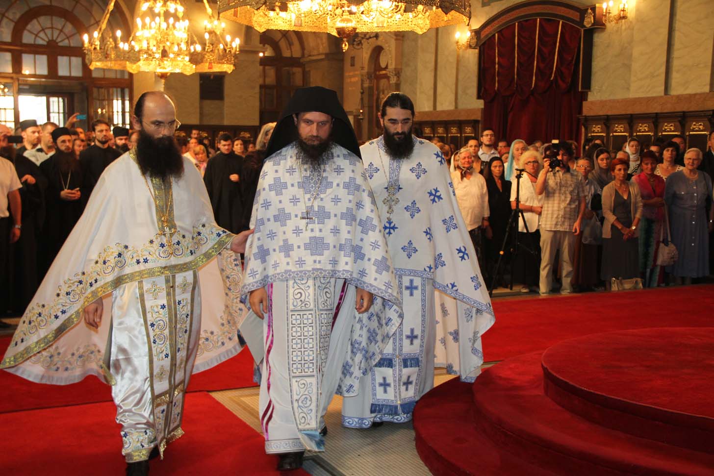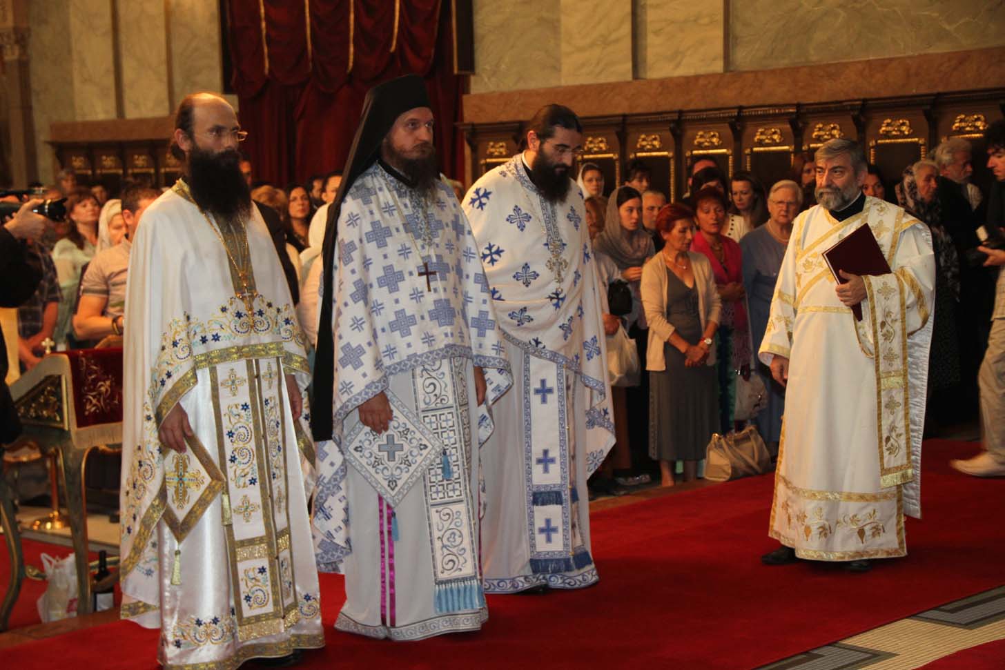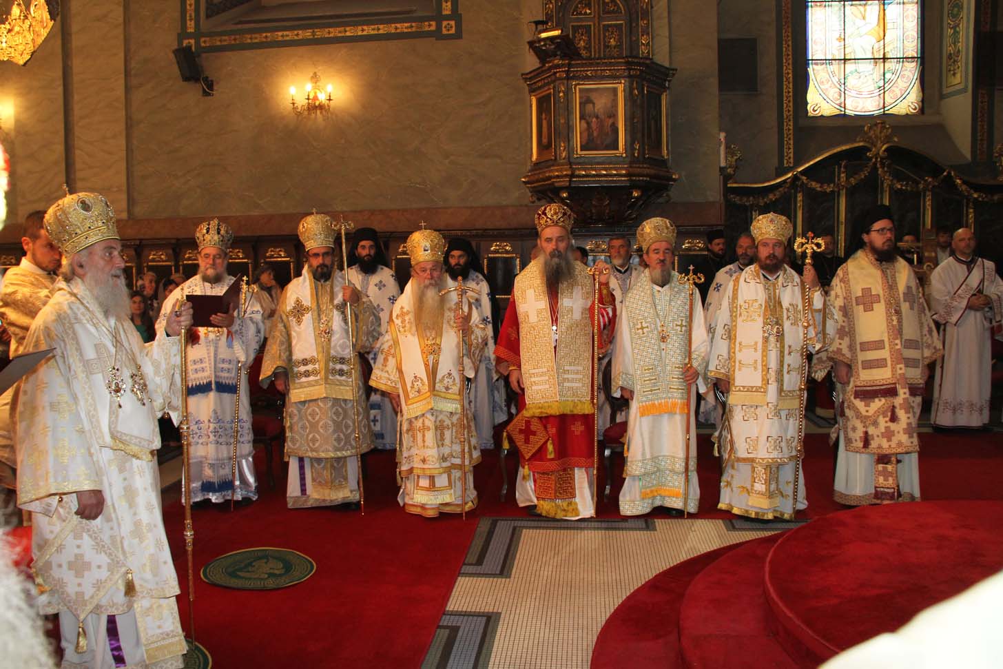 ![]() Епископ Сергије (Карановић) Наречење Дан раније, у петак, 25. јула 2014. године, на празник иконе Пресвете Богородице Тројеручице, у овом храму је служено и свечано бденије са наречењем архимандрита Сергија за епископа средњеевропског. Чином наречења началствовао је Његова Светост патријарх српски Иринеј, уз архијереје: сафитског Димитрија (Антиохијска црква), сремског Василија, банатског Никанора, зворничко-тузланског Хризостома, врањског Пахомија, бихаћко-петровачког Атанасија, ваљевског Милутина, рашко-призренског Теодосија, брегалничког Марка, умировљеног зворничко-тузланског Василија и умировљеног средњоевропског Константина. Архимандрит Сергије (Карановић) је за епископа средњеевропског изабран на овогодишњем редовном пролећном заседању Светог Архијерејског Сабора СПЦ, 23. маја. Пошто је, током службе наречења, пред целим сабрањем изјавио да се повинује вољи Светог Архијерејског Сабора, који га је и изабрао за епископа, началствовао је вечерњом службом Педесетнице. Саслуживали су му: архимандрит Иларион - новоизабрани епископ тимочки, архимандрит Арсеније - новоизабрани епископ топлички, архимандрит Јероним - новоизабрани епископ јегарски, као и архимандрит Серафим - игуман манастира Рмањ, уз служитеље Архиепископије београдско-карловачке. Појали су појци-студенти Богословског факултета у Београду и Прво београдско певачко друштво. Хиротонија Свету Архијерејску Литургију је, 26. јула, служио Његова Светост патријарх српски Иринеј, уз саслужење Високопреосвећеног митрополита загребачко-љубљанског Порфирија и преосвећену господу епископе: сремског Василија, бачког Иринеја, сафитског Димитрија, осечко-пољског Лукијана, зворничко-тузланског Хризостома, врањског Пахомија, бихаћко-петровачког Атанасија, горњокарловачког Герасима, далматинског Фотија, брегалничког Марка, крушевачког Давида, полошко-кумановског Јоакима, умировљеног средњоевропског Константина, као и архимандрита Илариона - новоизабраног епископа тимочког, архимандрита Арсенија - новоизабраног епископа топличког, архимандрита Јеронима - новоизабраног епископа јегарског. Молитвено учешће у овој свечаној служби узели су и епископи западноамерички Максим и умировљени зворничко-тузлански Василије. Саслуживали су свештенослужитељи из више епархија СПЦ. Свечаној Литургији присуствовали су и представници државних и градских власти, међу њима и: г. Милета Радојевић, директор Управе за сарадњу са црквама и верским заједницама; г. Игор Радојчић, председник Владе Републике Српске; г. Драган Давидовић, министар вера Републике Српске; аташе Немачке амбасаде у Београду; папски нунције надбискуп Орландо Антонини; представници Римокатоличке цркве из Немачке. Наречени владика Сергије је исповедио своју православну веру у Тројичног Бога, пред патријархом, архијерејима и читавом Црквом Божијом. Током Свете Литургије, по појању Трисвете песме, високодостојни архимандрит Сергије (Карановић) хиротонисан (рукоположен) је у чин епископа. На крају Литургије, епископу Сергију се обратио патријарх српски Иринеј, очинским поукама за будућу епископску службу. Затим се епископ средњоевропски Сергије обратио сабраном народу приступном беседом. Приступна беседа епископа Сергија У име Оца, Сина и Светога Духа. У име Оца,Сина и Светога Духа, ми Хришћани у свом живот