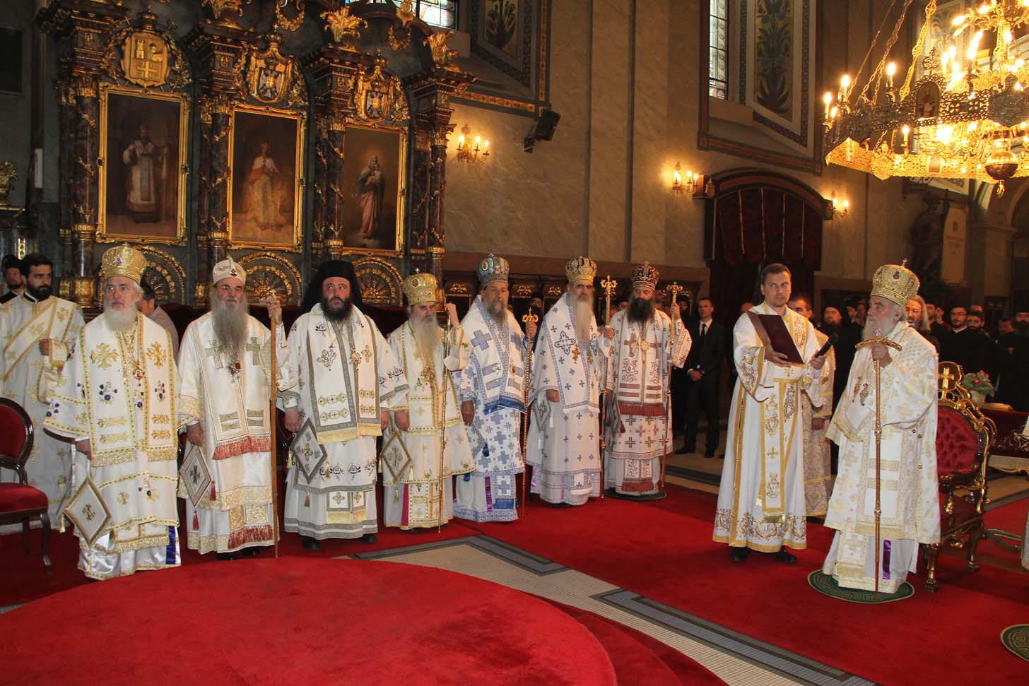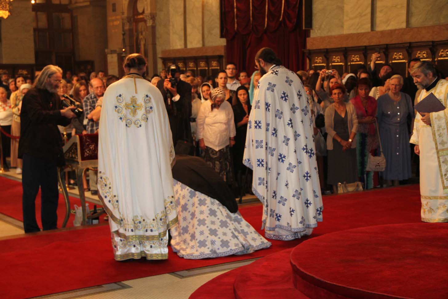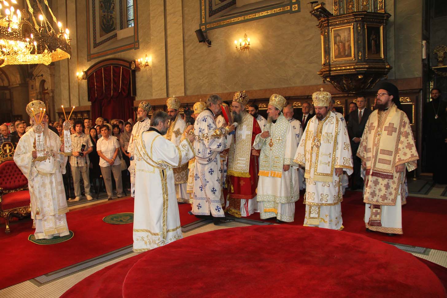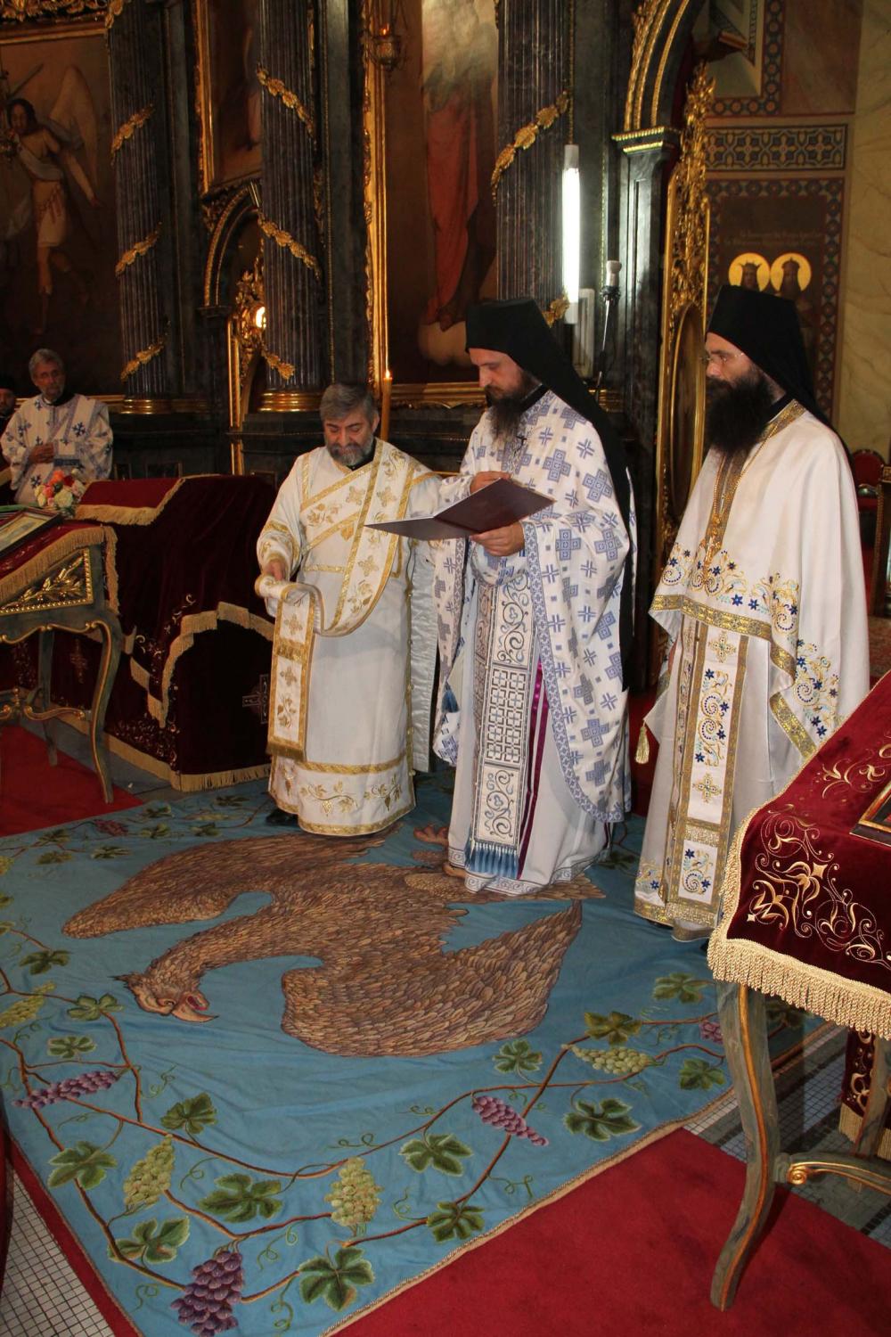 ![]() Епископ Сергије (Карановић) Наречење Дан раније, у петак, 25. јула 2014. године, на празник иконе Пресвете Богородице Тројеручице, у овом храму је служено и свечано бденије са наречењем архимандрита Сергија за епископа средњеевропског. Чином наречења началствовао је Његова Светост патријарх српски Иринеј, уз архијереје: сафитског Димитрија (Антиохијска црква), сремског Василија, банатског Никанора, зворничко-тузланског Хризостома, врањског Пахомија, бихаћко-петровачког Атанасија, ваљевског Милутина, рашко-призренског Теодосија, брегалничког Марка, умировљеног зворничко-тузланског Василија и умировљеног средњоевропског Константина. Архимандрит Сергије (Карановић) је за епископа средњеевропског изабран на овогодишњем редовном пролећном заседању Светог Архијерејског Сабора СПЦ, 23. маја. Пошто је, током службе наречења, пред целим сабрањем изјавио да се повинује вољи Светог Архијерејског Сабора, који га је и изабрао за епископа, началствовао је вечерњом службом Педесетнице. Саслуживали су му: архимандрит Иларион - новоизабрани епископ тимочки, архимандрит Арсеније - новоизабрани епископ топлички, архимандрит Јероним - новоизабрани епископ јегарски, као и архимандрит Серафим - игуман манастира Рмањ, уз служитеље Архиепископије београдско-карловачке. Појали су појци-студенти Богословског факултета у Београду и Прво београдско певачко друштво. Хиротонија Свету Архијерејску Литургију је, 26. јула, служио Његова Светост патријарх српски Иринеј, уз саслужење Високопреосвећеног митрополита загребачко-љубљанског Порфирија и преосвећену господу епископе: сремског Василија, бачког Иринеја, сафитског Димитрија, осечко-пољског Лукијана, зворничко-тузланског Хризостома, врањског Пахомија, бихаћко-петровачког Атанасија, горњокарловачког Герасима, далматинског Фотија, брегалничког Марка, крушевачког Давида, полошко-кумановског Јоакима, умировљеног средњоевропског Константина, као и архимандрита Илариона - новоизабраног епископа тимочког, архимандрита Арсенија - новоизабраног епископа топличког, архимандрита Јеронима - новоизабраног епископа јегарског. Молитвено учешће у овој свечаној служби узели су и епископи западноамерички Максим и умировљени зворничко-тузлански Василије. Саслуживали су свештенослужитељи из више епархија СПЦ. Свечаној Литургији присуствовали су и представници државних и градских власти, међу њима и: г. Милета Радојевић, директор Управе за сарадњу са црквама и верским заједницама; г. Игор Радојчић, председник Владе Републике Српске; г. Драган Давидовић, министар вера Републике Српске; аташе Немачке амбасаде у Београду; папски нунције надбискуп Орландо Антонини; представници Римокатоличке цркве из Немачке. Наречени владика Сергије је исповедио своју православну веру у Тројичног Бога, пред патријархом, архијерејима и читавом Црквом Божијом. Током Свете Литургије, по појању Трисвете песме, високодостојни архимандрит Сергије (Карановић) хиротонисан (рукоположен) је у чин епископа. На крају Литургије, епископу Сергију се обратио патријарх српски Иринеј, очинским поукама за будућу епископску службу. Затим се епископ средњоевропски Сергије обратио сабраном народу приступном беседом. Приступна беседа епископа Сергија У име Оца, Сина и Светога Духа. У име Оца,Сина и Светога Духа, ми Хришћани у свом живот