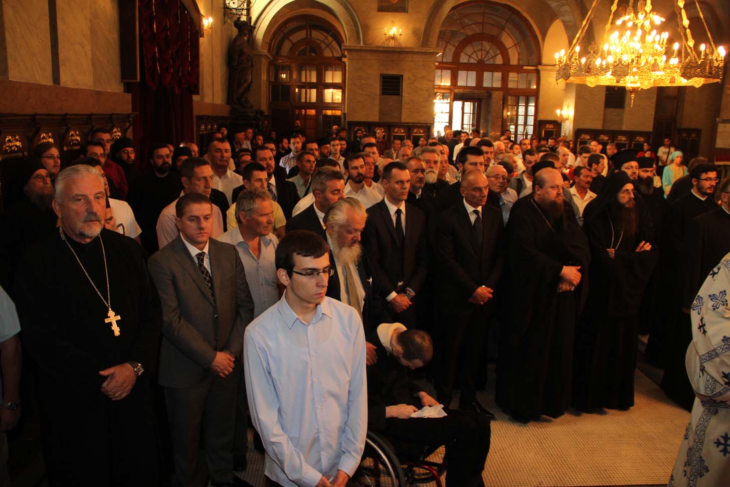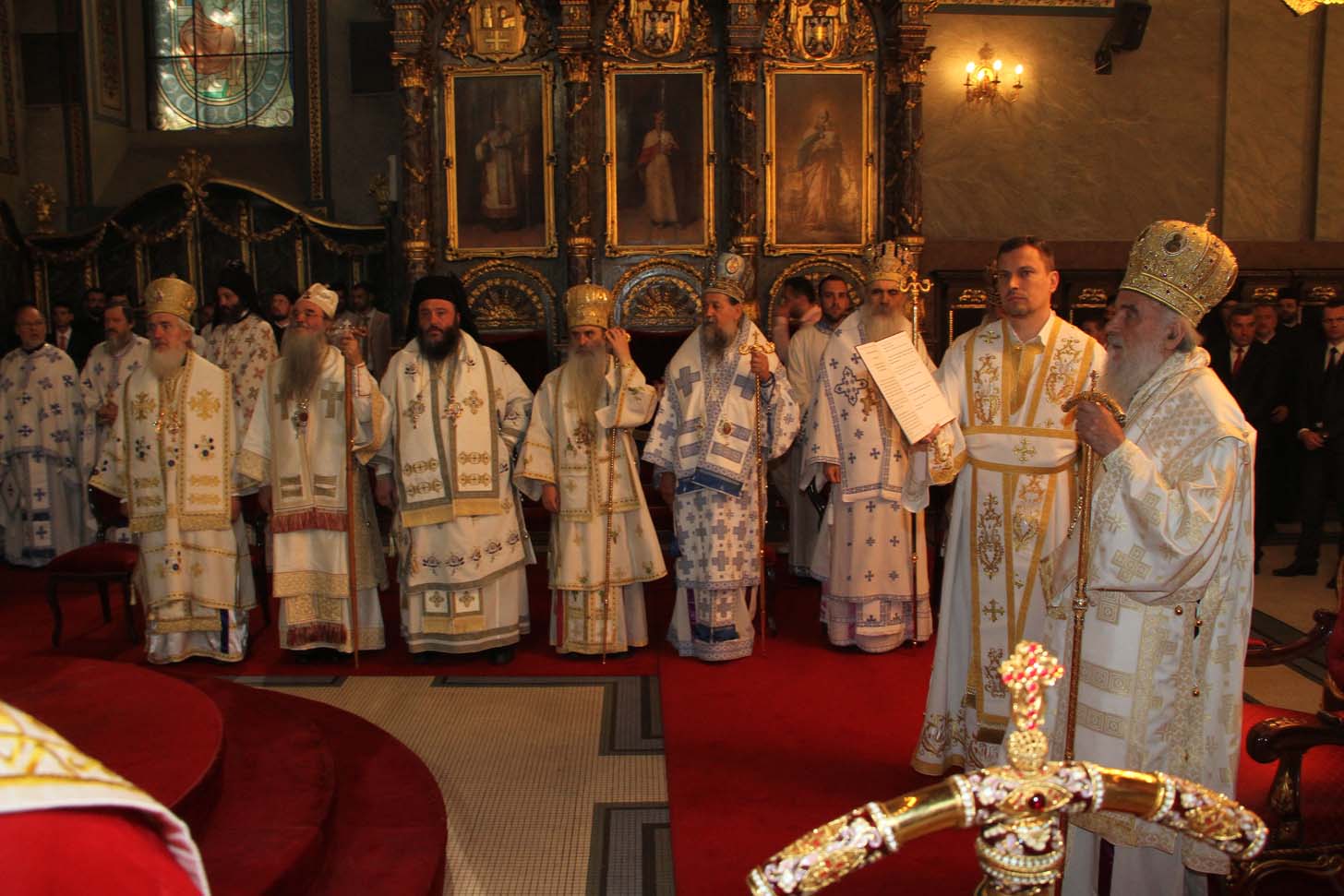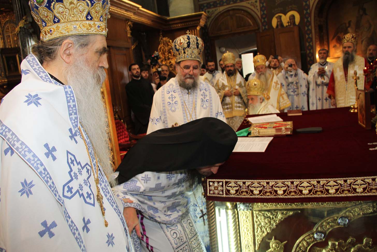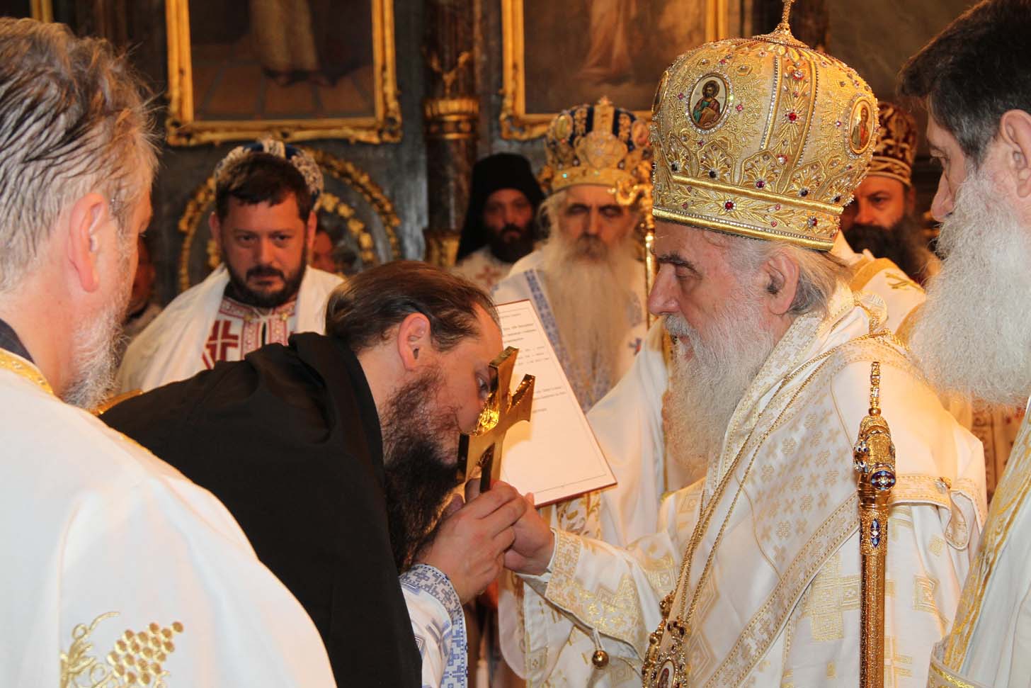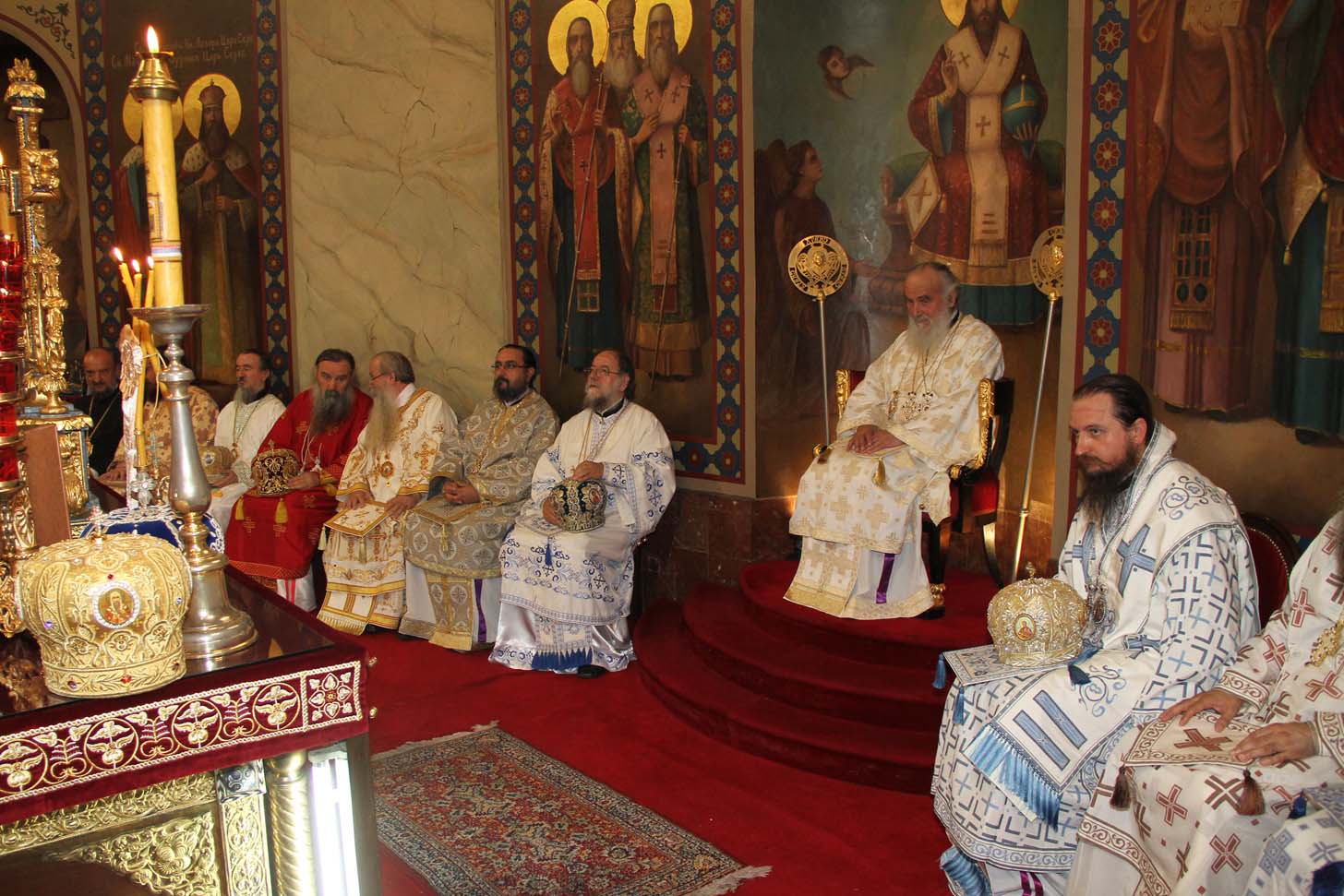 ![]() Епископ Сергије (Карановић) Наречење Дан раније, у петак, 25. јула 2014. године, на празник иконе Пресвете Богородице Тројеручице, у овом храму је служено и свечано бденије са наречењем архимандрита Сергија за епископа средњеевропског. Чином наречења началствовао је Његова Светост патријарх српски Иринеј, уз архијереје: сафитског Димитрија (Антиохијска црква), сремског Василија, банатског Никанора, зворничко-тузланског Хризостома, врањског Пахомија, бихаћко-петровачког Атанасија, ваљевског Милутина, рашко-призренског Теодосија, брегалничког Марка, умировљеног зворничко-тузланског Василија и умировљеног средњоевропског Константина. Архимандрит Сергије (Карановић) је за епископа средњеевропског изабран на овогодишњем редовном пролећном заседању Светог Архијерејског Сабора СПЦ, 23. маја. Пошто је, током службе наречења, пред целим сабрањем изјавио да се повинује вољи Светог Архијерејског Сабора, који га је и изабрао за епископа, началствовао је вечерњом службом Педесетнице. Саслуживали су му: архимандрит Иларион - новоизабрани епископ тимочки, архимандрит Арсеније - новоизабрани епископ топлички, архимандрит Јероним - новоизабрани епископ јегарски, као и архимандрит Серафим - игуман манастира Рмањ, уз служитеље Архиепископије београдско-карловачке. Појали су појци-студенти Богословског факултета у Београду и Прво београдско певачко друштво. Хиротонија Свету Архијерејску Литургију је, 26. јула, служио Његова Светост патријарх српски Иринеј, уз саслужење Високопреосвећеног митрополита загребачко-љубљанског Порфирија и преосвећену господу епископе: сремског Василија, бачког Иринеја, сафитског Димитрија, осечко-пољског Лукијана, зворничко-тузланског Хризостома, врањског Пахомија, бихаћко-петровачког Атанасија, горњокарловачког Герасима, далматинског Фотија, брегалничког Марка, крушевачког Давида, полошко-кумановског Јоакима, умировљеног средњоевропског Константина, као и архимандрита Илариона - новоизабраног епископа тимочког, архимандрита Арсенија - новоизабраног епископа топличког, архимандрита Јеронима - новоизабраног епископа јегарског. Молитвено учешће у овој свечаној служби узели су и епископи западноамерички Максим и умировљени зворничко-тузлански Василије. Саслуживали су свештенослужитељи из више епархија СПЦ. Свечаној Литургији присуствовали су и представници државних и градских власти, међу њима и: г. Милета Радојевић, директор Управе за сарадњу са црквама и верским заједницама; г. Игор Радојчић, председник Владе Републике Српске; г. Драган Давидовић, министар вера Републике Српске; аташе Немачке амбасаде у Београду; папски нунције надбискуп Орландо Антонини; представници Римокатоличке цркве из Немачке. Наречени владика Сергије је исповедио своју православну веру у Тројичног Бога, пред патријархом, архијерејима и читавом Црквом Божијом. Током Свете Литургије, по појању Трисвете песме, високодостојни архимандрит Сергије (Карановић) хиротонисан (рукоположен) је у чин епископа. На крају Литургије, епископу Сергију се обратио патријарх српски Иринеј, очинским поукама за будућу епископску службу. Затим се епископ средњоевропски Сергије обратио сабраном народу приступном беседом. Приступна беседа епископа Сергија У име Оца, Сина и Светога Духа. У име Оца,Сина и Светога Духа, ми Хришћани у свом живот